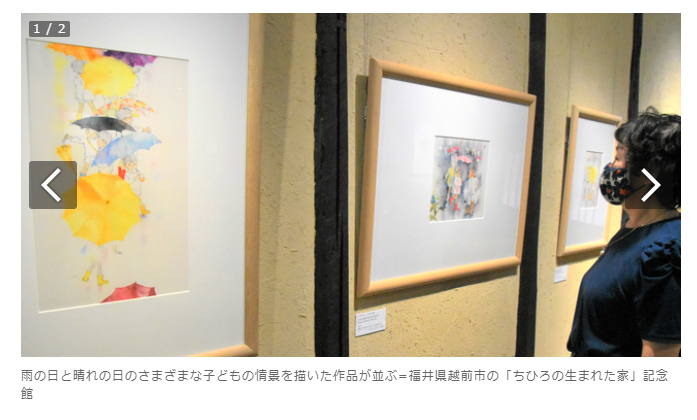 子どもを描き続けた絵本画家いわさきちひろの生誕地・越前市にある「ちひろの生まれた家」記念館で企画展「ちひろ雨の日晴れの日」展が開かれている。雨のなかや明るい日差しのもとで遊ぶ子どもらを水彩技法でやさしく描いた作品13点を紹介。水彩画は劣化が避けられないため、「ピエゾグラフ」と呼ばれる方法で精巧に再現した複製画を展示している。色とりどりの傘が開いた情景や、ぬれた子犬を気に掛ける様子を描いた作品などが目を引く。9月4日まで。