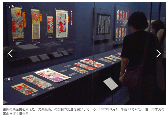 富山の薬売りが、得意先の心をつかむために贈った浮世絵「売薬版画」を集めた企画展が、富山市郷土博物館で開かれている。江戸や上方に次ぐほど盛んに出版され、薬業を支えた約100年の歴史、画題の変遷などを紹介している。現在は後期展で、歌舞伎役者や名所、福の神を描いたものなど江戸~大正までの約50点が並ぶ。