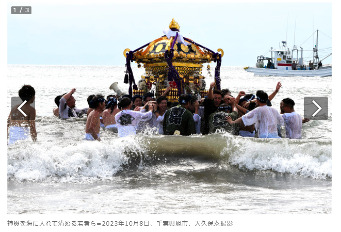 松澤熊野神社の式年神幸祭があり、8日は神輿を清めるために海に入れる「お浜降り」が24年ぶりに営まれた。担ぎ手の若者らが気勢を上げた。平安時代から12年に一度、卯年に行われ今回が90回目。豊作や大漁を祝う。前回は東日本大震災が発生し、お浜降りは行われなかった。この日は三川浜で50人ほどの若者らが交代で神輿を担いで海に入った。