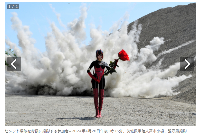 映画やテレビ番組などの特撮で使われる爆破シーン。茨城県常陸大宮市の採石場は、知る人ぞ知る爆破ロケの「聖地」で、28日には「爆破」を体験できるイベントがあった。コスプレ姿などの約20人が参加し、高さ10メートルほどに噴き上がった炎を背景に撮影を楽しんだ。