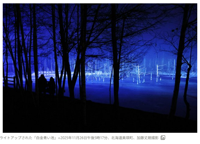 北海道美瑛町の観光地「白金青い池」がライトアップされ、幻想的な風景が観光客の人気を集めている。日没ごろから午後9時まで、10分間のゆっくりとしたリズムの照明パターンが繰り返される。12月17日からは、氷結して雪が積もった湖面をスクリーンに見立てた照明パターンに変わるという。