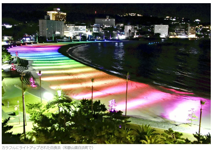 冬の夜の白良浜をカラフルにライトアップするイベント「白良浜ライトパレード」が始まった。来年3月15日までの午後5~10時に点灯される。閑散期にも観光客らに訪れてもらおうと、南紀白浜観光協会などで作る実行委員会が2023年から実施。約620メートルの砂浜に、赤や黄、青など7色のライトを計31基設置して浜辺を照らすほか、音楽も流し、幻想的な雰囲気を楽しめるようにする。28日に点灯式があり、同協会会長の新藤正悟実行委員長は「冬しか見られない白良浜の景色を楽しんでほしい」と話した。