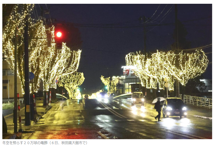 「大館シャイニングストリート」点灯、冬の並木道を光り輝かせる20万球│秋田県
