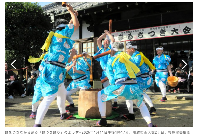唄に合わせて踊りながら餅つきをする埼玉県指定無形民俗文化財の「餅つき踊り」が11日、西福寺であり、住民らが地域の伝統行事を楽しんだ。南大塚餅つき踊り保存会によると、餅つき踊りは江戸の幕末、裕福な家が子どもの7歳祝いのため「餅つき連中」に餅つき踊りを頼んでいたのが由来とされる。戦時中は途絶えていたが、戦後に再開され、地域の祭りとして実施されるようになった。