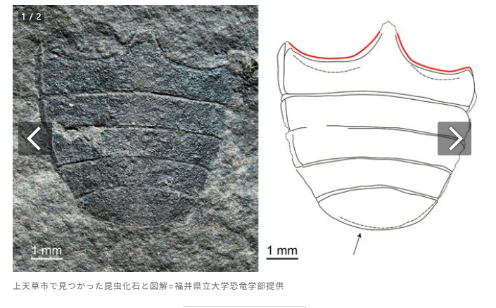 熊本県上天草市内で見つかった化石が、約8500万年前、中生代後期白亜紀の昆虫類の化石であることがわかった。恐竜時代の昆虫化石の発見は九州初とされ、当時の陸上の生態系や東アジアの昆虫化石の多様性を知る上で貴重な資料だ。天草市立御所浦恐竜の島博物館や福井県立大学、同県立恐竜博物館などの共同研究で明らかになった。研究の成果は長崎市で見つかった昆虫化石とともに一本の論文にまとめられ、昨年9月下旬、日本古生物学会の国際学術誌のウェブサイトに掲載された。