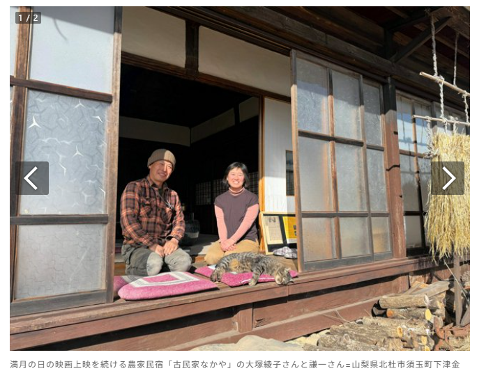 満月の日、映画館が消滅して久しい山梨県北杜市の古民家で、映画上映会が開かれている。派手なアクションや勧善懲悪のドラマはない。日本の農山漁村の手仕事や伝統文化をていねいに記録した映画を、ストーブの火であたたまりながら、じっくり鑑賞する。2月2日の満月の日、今年初めての上映会が開かれる。上映会は年5回のペースで開かれている。会場は、りんごの産地としても知られる北杜市須玉町下津金の農家民宿「古民家なかや」だ。