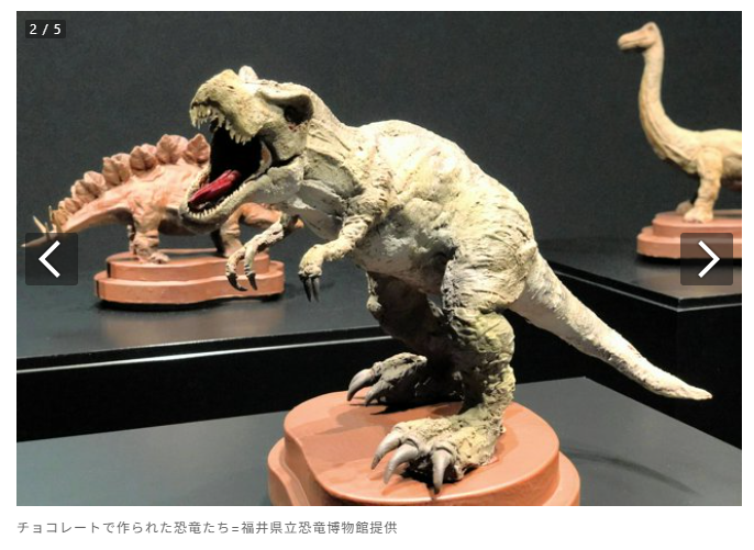 福井県立恐竜博物館で、チョコレートの恐竜が展示されている。子どもの頃から恐竜好きだったという「パティシエエスコヤマ」の小山進さんが制作。計11点を展示している。