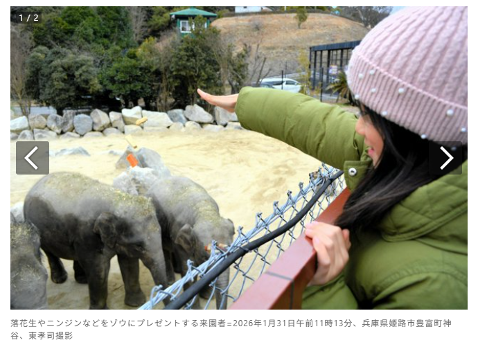 節分を前に、兵庫県姫路市の姫路セントラルパークの「ゾウの森バナーガッタ」で1月31日、エサやりを兼ねた「豆まき」のイベントがあった。ゾウの森では、インドからやってきたアジアゾウ4頭が昨夏から暮らしている。来園した子どもたちは、飼育員から殻付きの落花生やカットしたサツマイモなどを受け取ると、「鬼は外、福は内」と言いながら4頭に向かって投げてプレゼントした。