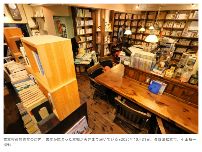 大リーグの大谷翔平選手のおかげで、すっかり世の中に定着した「二刀流」。この店も、まさに「二刀流」だ。松本城のすぐ南東にあり、大正レトロの商店街の一角にある「古本喫茶想雲堂」。古本を売る一方、コーヒーやアルコール類などが楽しめるカフェだ。