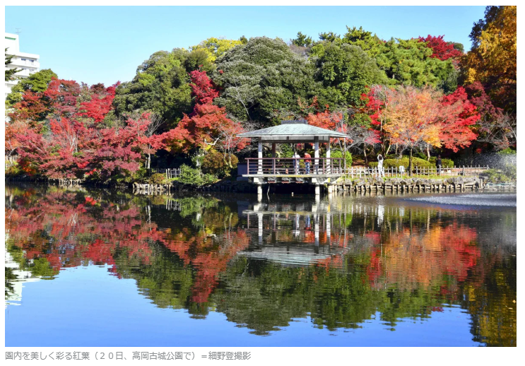 高岡古城公園では、樹木が紅葉のシーズンを迎えている。20日は澄み渡る青空を背景に、色鮮やかな葉が美しく浮かび上がっていた。散策に訪れた人たちは足を止めて真っ赤な葉を眺め、静かな晩秋を満喫していた。