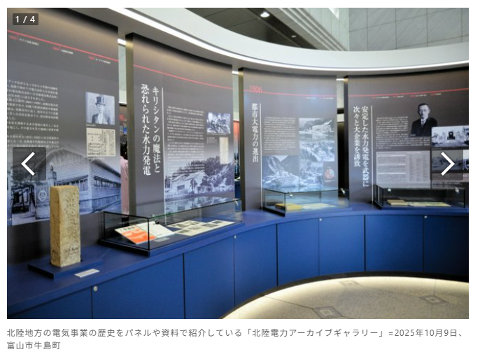明治期以降、水力を軸に発展した北陸の電気事業の歴史をたどるアーカイブギャラリーが、富山市の北陸電力本店1階にオープンした。電源開発に尽くした先人の歩みや現在の事業に理解を深めてもらおうと、同社がフロアを改装して設けた。ギャラリーは約300平方メートルで、書類などの資料54点やパネルが並ぶ。1893年、北陸で初めて金沢市で電灯がともされた後、各県で水力発電が始まった経緯から説き起こす。