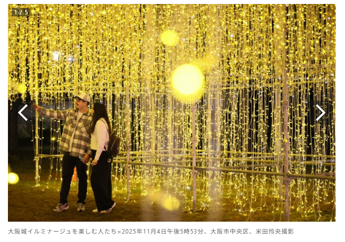 大阪城公園・西の丸庭園で、約350万球のLEDが城を彩る「大阪城イルミナージュ」が始まっている。入り口に設置された金色のイルミネーションのアーチでは、多くの来場者が足を止めて写真撮影などを楽しんだ。点灯時間は午後5時~9時半。入場料は中学生以上2千円、小学生以下千円、1歳未満は無料。来年2月1日まで。