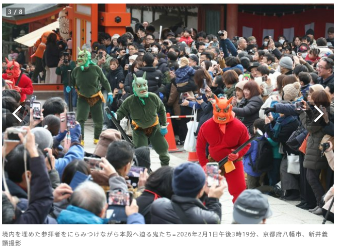 石清水八幡宮で1日、古式にのっとった節分行事「鬼やらい神事」があり、今年の無病息災を願った。鬼を追い払う「鬼やらい人」が、四方と今年の恵方に向け、邪気をはらうとされる桃の枝が飾り付けられた弓で射抜くなどした。この後、本殿前に、こん棒を持った鬼たちが登場。鬼やらい人や年男、年女たちが「鬼やろう」と声を上げ「福豆」を投げつけると、鬼たちは坂を転げ落ち退散した。集まった参拝者には福豆が振る舞われた。