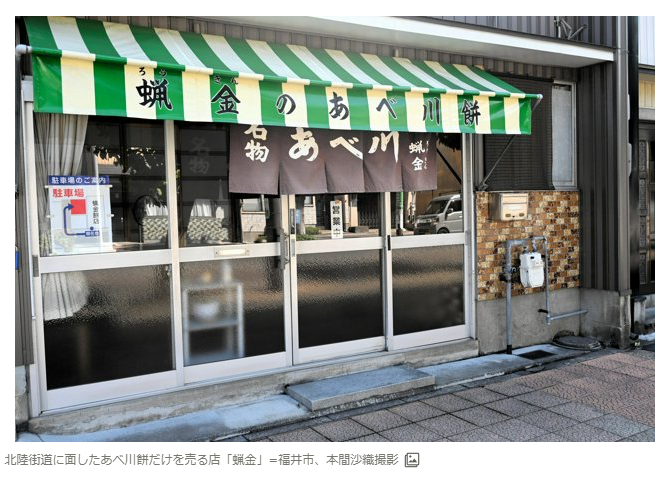 「安倍川餅」といえば静岡の名物として知られるが、福井では独自の「あべ川餅」が浸透しているのをご存じだろうか。その秘密を探ろうと、老舗を訪ねた。福井駅から車で10分。宿場町で栄えた旧北陸街道沿いに「名物あべ川蝋金」と書かれたのれんがかかった店がある。6代目の中村敏雄さん、美由紀さん夫婦が切り盛りする。メニューはあべ川餅のみ。7個入りを注文した。