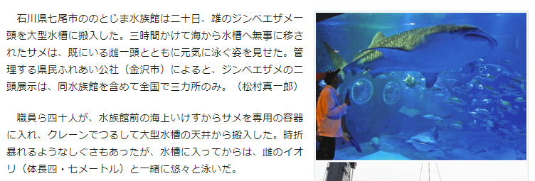 のとじま水族館のジンベエザメ2匹のうち、雄の「モモベエ」が7日、水族館から搬出され、能登沖約30キロで放流された。体が大きくなり、展示水槽の大きさと体長を考慮した結果、これ以上の飼育は体への負担が掛かると水族館が判断したためで、ジンベエザメの搬出は3回目になる。もう1匹の雌「イオリ」の飼育は今後も続けられる。