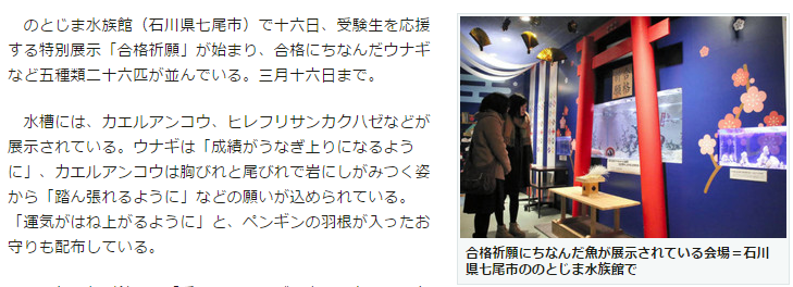 成績 うなぎ上りに のとじま水族館 合格祈願の展示│石川県