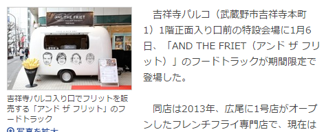 吉祥寺パルコ1階正面入り口前の特設会場に1月6日、「ANDTHEFRIET」のフードトラックが期間限定で登場した。同店は2013年、広尾に1号店がオープンしたフレンチフライ専門店で、現在は「ラフォーレ原宿」と「横浜ビブレ」に出店し、3店舗で展開する。営業時間は11時~20時。今月22日まで。
