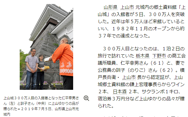 山形県上山市元城内の郷土資料館「上山城」の入館者が5日、300万人を突破した。近年は年5万人ほど来館しているといい、1982年11月のオープンから約37年での達成となった。