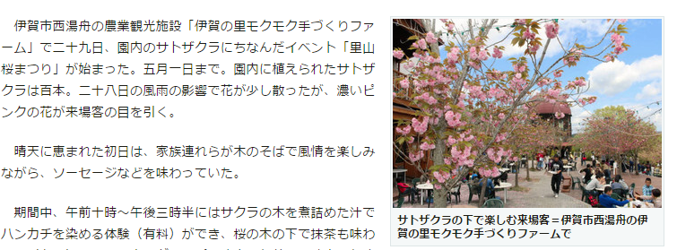 農業観光施設「伊賀の里モクモク手づくりファーム」で29日、園内のサトザクラにちなんだイベント「里山桜まつり」が始まった。五月一日まで。園内に植えられたサトザクラは百本。28日の風雨の影響で花が少し散ったが、濃いピンクの花が来場客の目を引く。