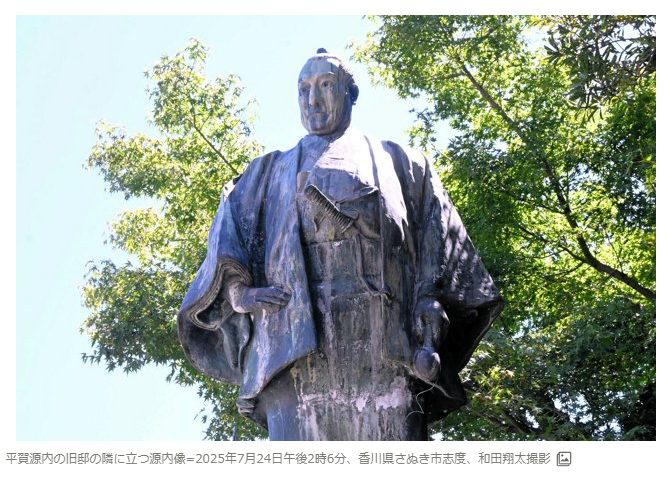 NHK大河ドラマ「べらぼう~蔦重栄華乃夢噺~」の放送をきっかけに、江戸時代の発明家、平賀源内への関心が高まり、故郷の香川県さぬき市を訪れる人が増えている。瀬戸内国際芸術祭の夏会期では同市が初めて会場の一つになり、相乗効果で盛り上がりを見せている。今月14日、同市志度の四国霊場第86番札所志度寺から西に延びる門前通りを訪ねると、リュックを背負いカメラを手にした観光客や家族連れらでにぎわっていた。