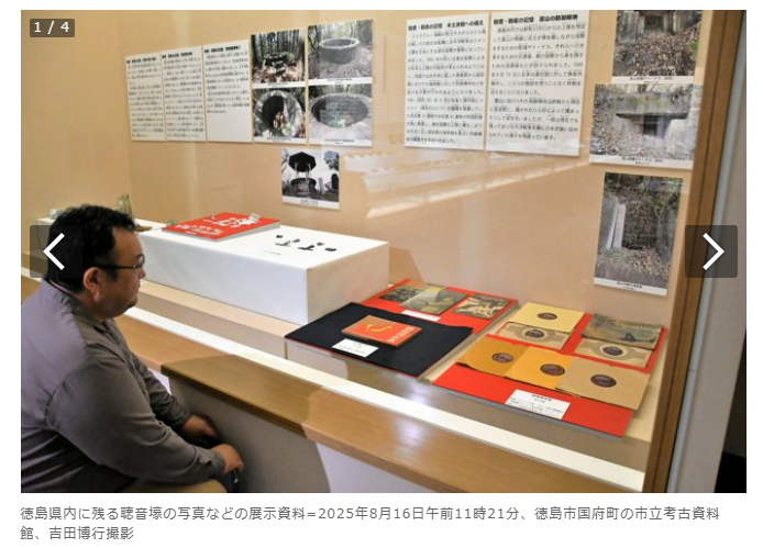 戦争中、敵機のエンジン音を山中に設けた穴の中から聴いて接近を察知していた「聴音壕」など徳島県内に残る戦争遺跡や資料を紹介する「戦争の記憶考古資料が語る戦争」が31日まで、徳島市国府町の市立考古資料館で開かれている。終戦から80年に合わせて企画した。同館によると、県内には空襲の警戒をした「防空監視哨」が19カ所あったとされる。その多くにレンガやコンクリートで造られた聴音壕が設けられたという。