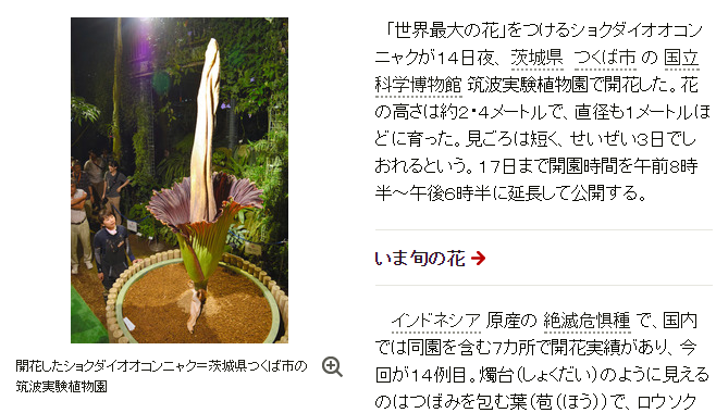 「世界最大の花」をつけるショクダイオオコンニャクが14日夜、国立科学博物館筑波実験植物園で開花した。花の高さは約2.4メートルで、直径も1メートルほどに育った。見ごろは短く、せいぜい3日でしおれるという。17日まで開園時間を午前8時半~午後6時半に延長して公開する。