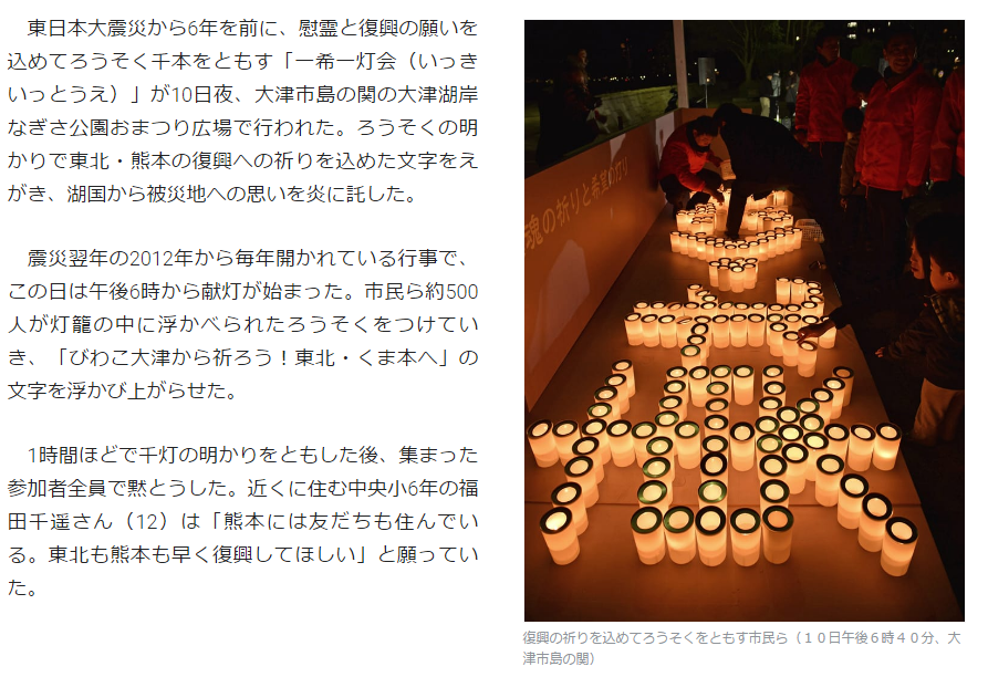 東日本大震災から6年を前に、慰霊と復興の願いを込めてろうそく1000本をともす「一希一灯会」が10日夜、大津市島の関の大津湖岸なぎさ公園おまつり広場で行われた。ろうそくの明かりで東北・熊本の復興への祈りを込めた文字をえがき、湖国から被災地への思いを炎に託した。