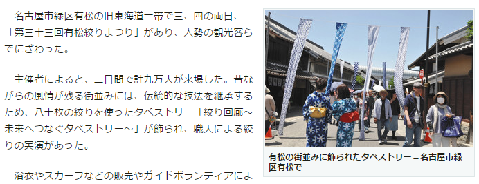 名古屋市緑区有松の旧東海道一帯で3、4の両日、「第33回有松絞りまつり」があり、大勢の観光客らでにぎわった。主催者によると、2日間で計9万人が来場した。昔ながらの風情が残る街並みには、伝統的な技法を継承するため、80枚の絞りを使ったタペストリー「絞り回廊~未来へつなぐタペストリー~」が飾られ、職人による絞りの実演があった。