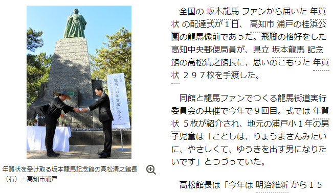 全国の坂本龍馬ファンから届いた年賀状の配達式が1日、桂浜公園の龍馬像前であった。飛脚の格好をした高知中央郵便局員が、県立坂本龍馬記念館の高松清之館長に、思いのこもった年賀状297枚を手渡した。
