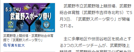 武蔵野市立武蔵野陸上競技場、武蔵野総合体育館で5月3日、「武蔵野スポーツ祭り」が開催される。主に多摩地区や世田谷地区を拠点とする3つのスポーツチームが、武蔵野陸上競技場、武蔵野総合体育館で公式戦を行う。