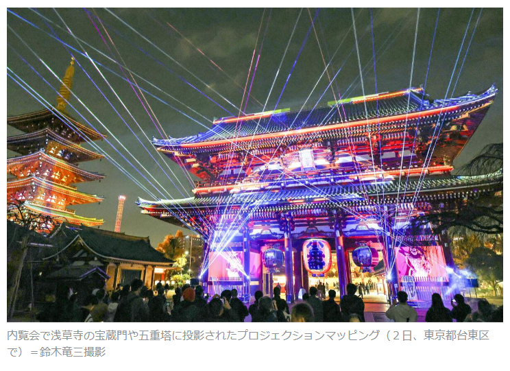 浅草寺で3日から、伝統行事などを題材にしたプロジェクションマッピングが始まる。2日夜に行われた内覧会では、境内の宝蔵門や五重塔、二天門に鮮やかな仁王像や竜の姿などが投影され、居合わせた観光客らから大きな拍手が上がった。プロジェクションマッピングは、7日までの毎日午後5時半~9時半に行われ、誰でも無料で観賞できる。