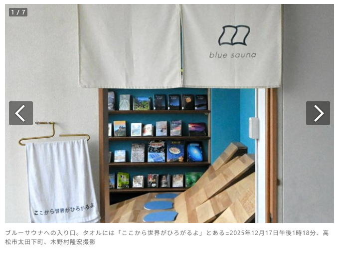 白いのれんをくぐると、青と白の壁で明るさを感じさせる室内に、ゆったり座れる椅子5脚が並ぶ。斜めの背もたれに体を預けると、窓の向こうには青空が見えた。まるで、街中にあるおしゃれなカフェのような空間。ここは、高松市立太田南小学校の校舎にある図書室の一つだ。本棚に並ぶのは「空と旅」をテーマにした20冊ほどの作品。4人の児童が2人1組になって本を読んでいた。この部屋は心を整える読書をコンセプトに「ブルーサウナ」と名付けられている。図書室だけでなく廊下や階段など、校内の至る所に本や読書用の椅子が置かれている。