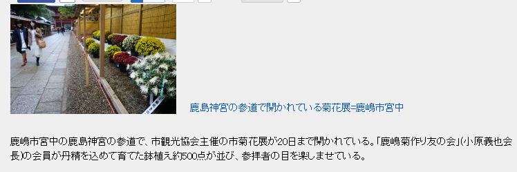 鹿島神宮の参道で、市観光協会主催の市菊花展が20日まで開かれている。「鹿嶋菊作り友の会」(小原義也会長)の会員が丹精を込めて育てた鉢植え約500点が並び、参拝者の目を楽しませている。